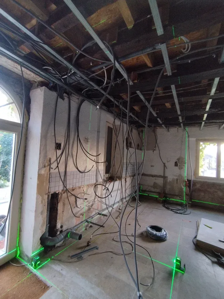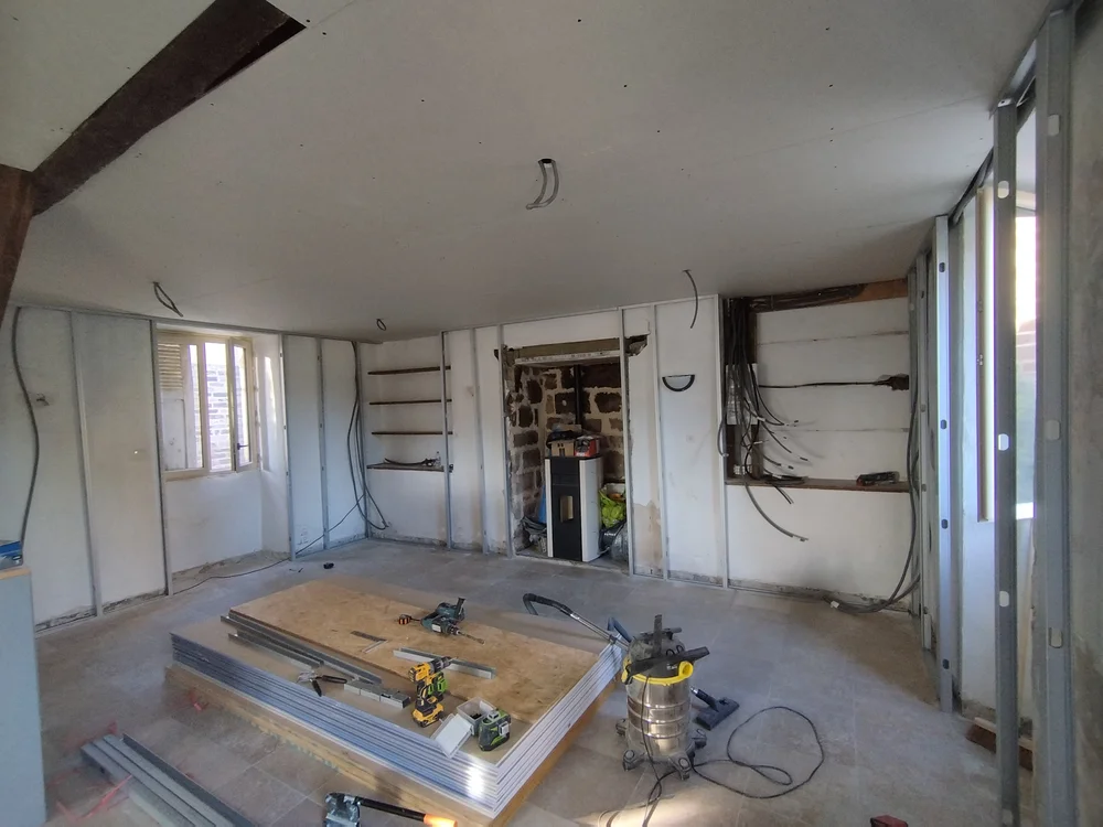 Nous avons réaliser la nouvelle installation électrique avec un tableau dédié à la dépendance. Ensuite nous avons créer un plafond suspendu pour le doublages des plafonds