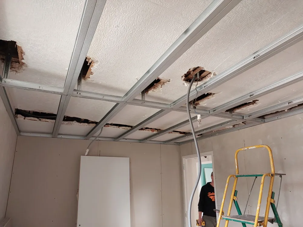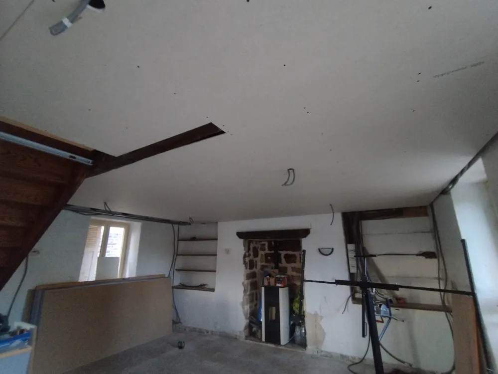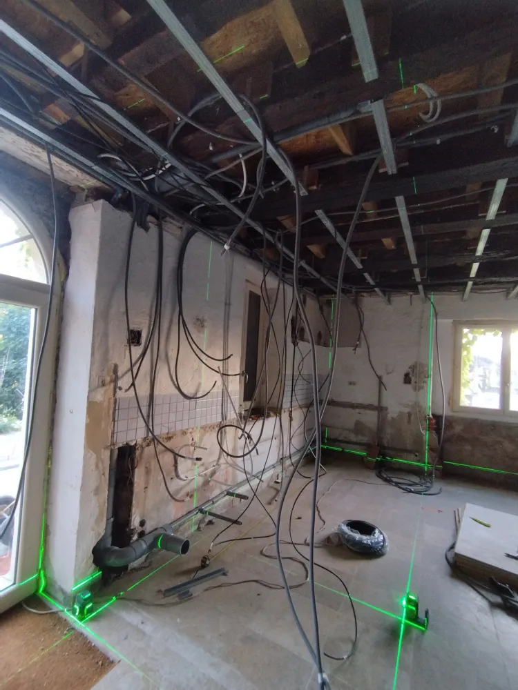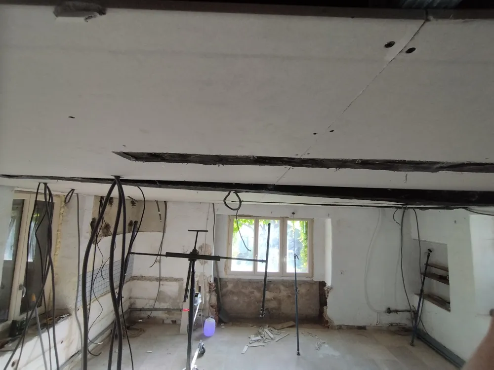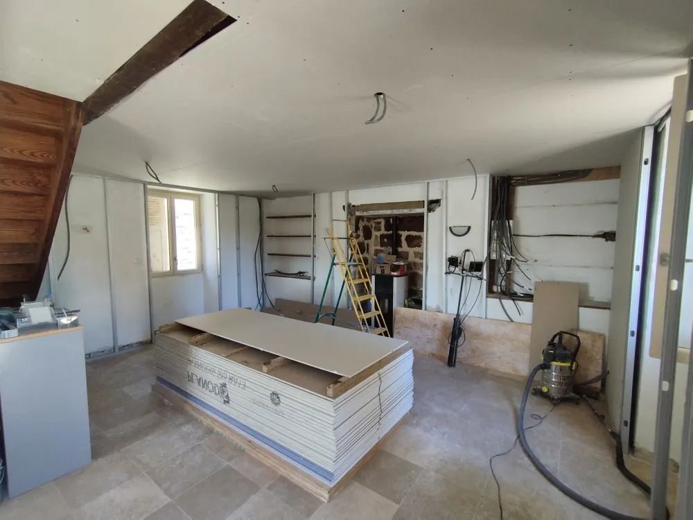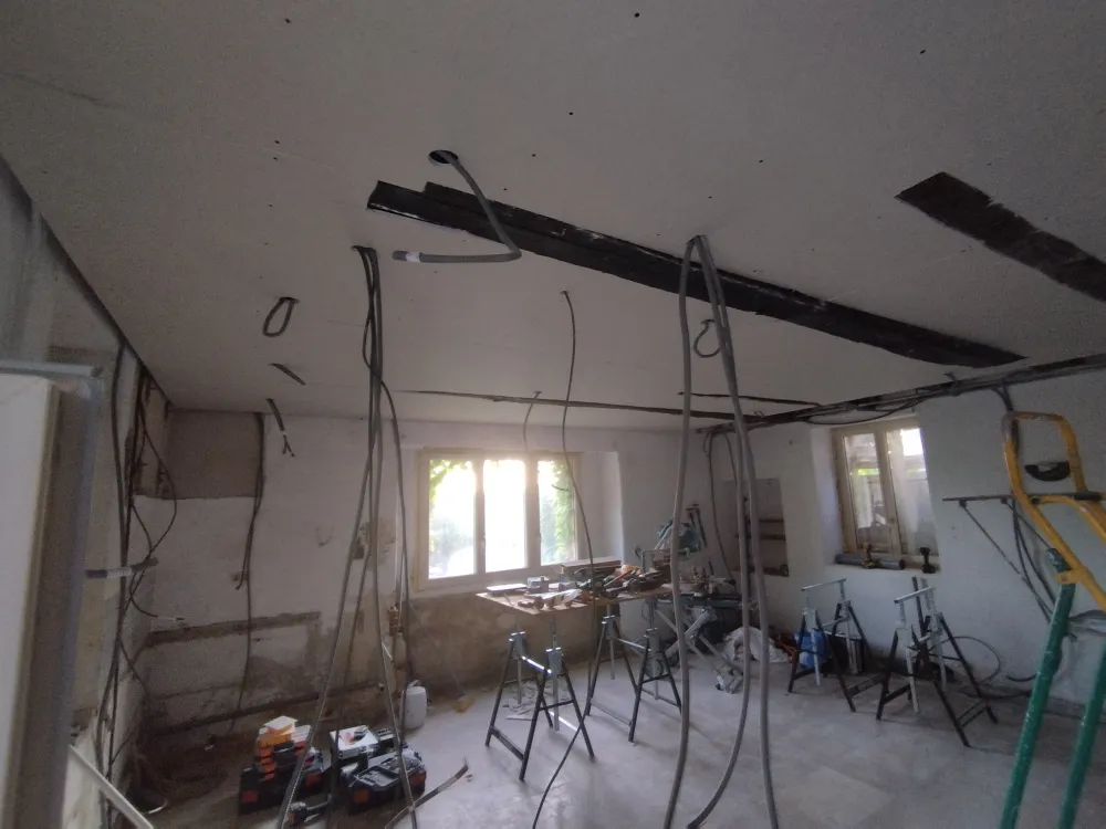 Nous avons réaliser la nouvelle installation électrique avec un tableau dédié à la dépendance. Ensuite nous avons créer un plafond suspendu pour le doublages des plafonds.