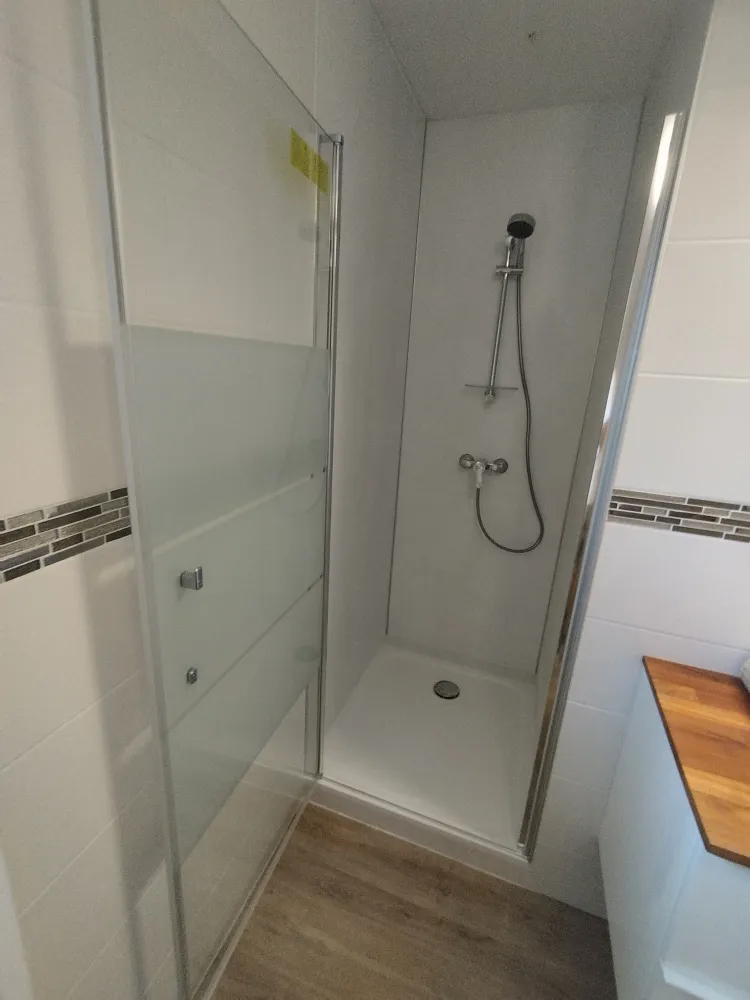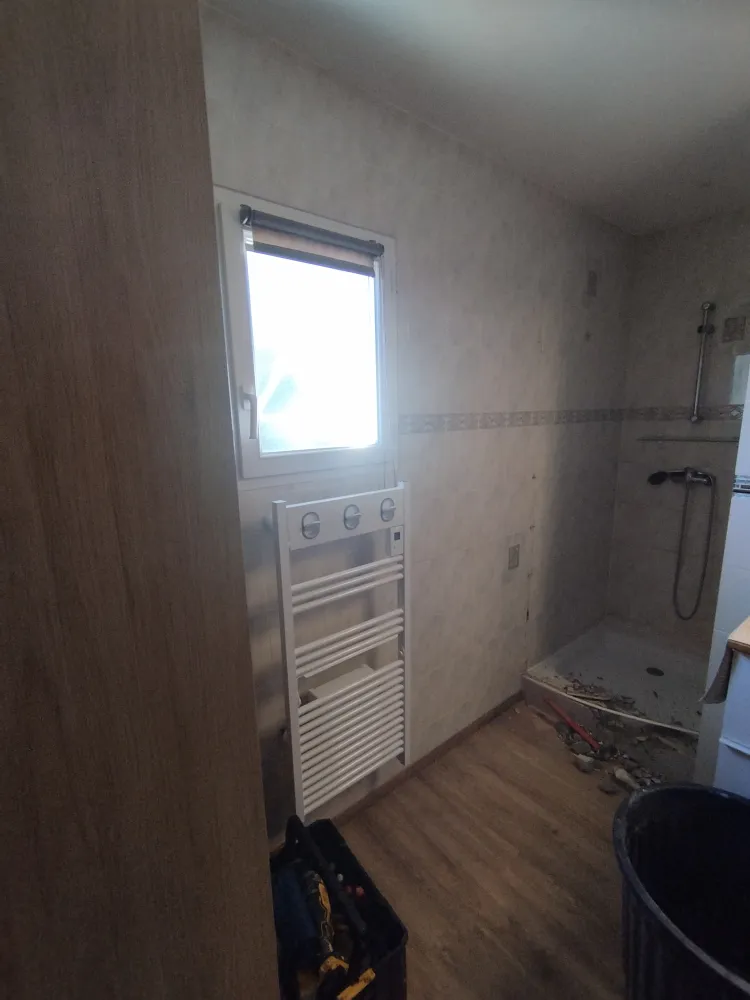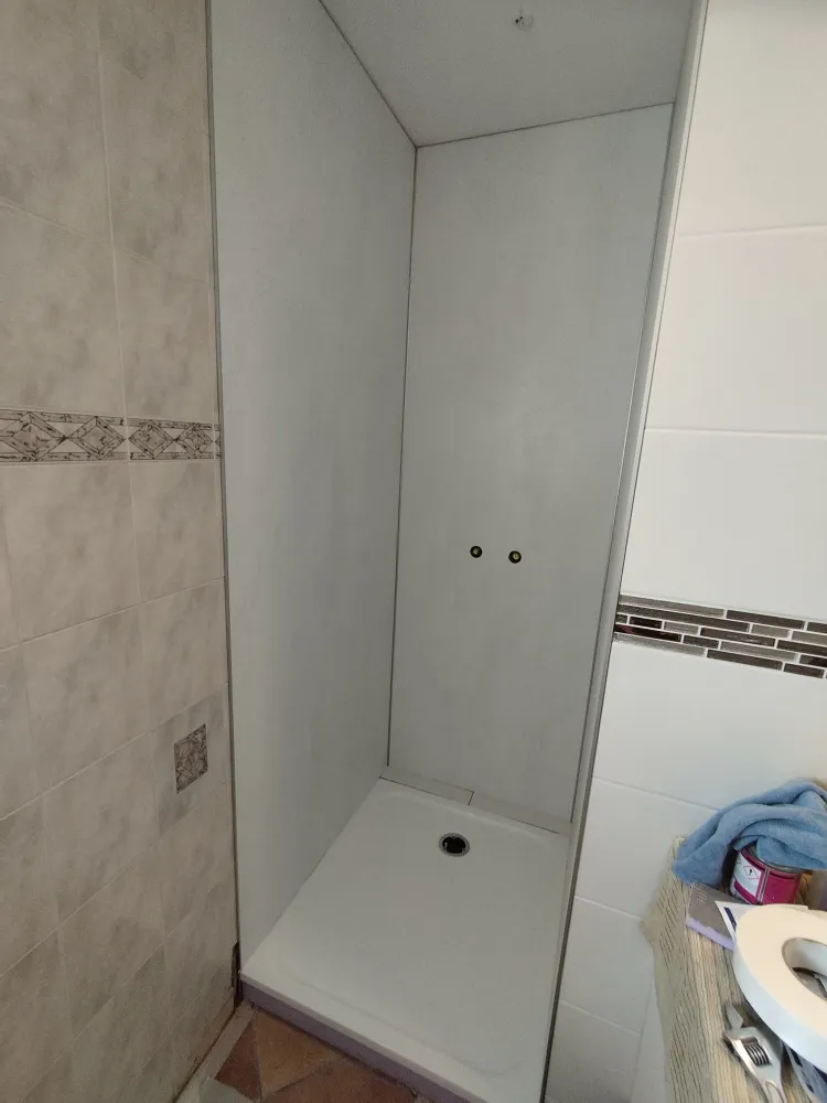 Nous avons casser l'ancien bac à douche, remonter un bac à douche et poser des panneaux muraux dans la douche à la demande du client. Nous avons ensuite poser de la faïence sur le reste des murs de la salle de bain, puis nous avons posé un parquet stratifié au sol.